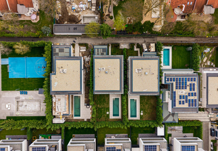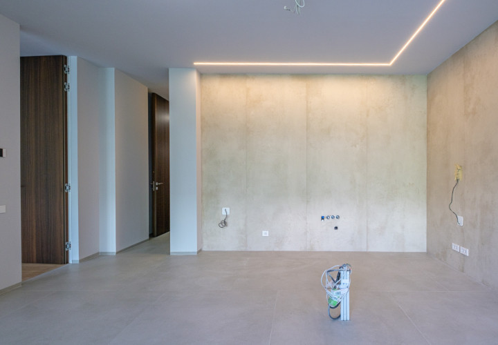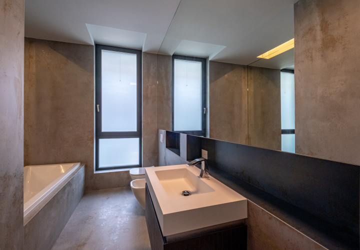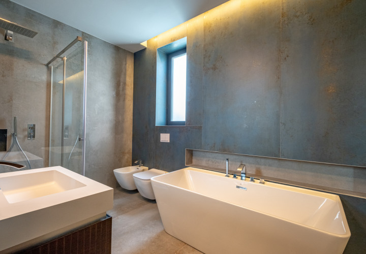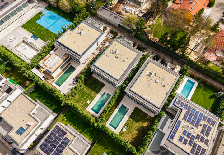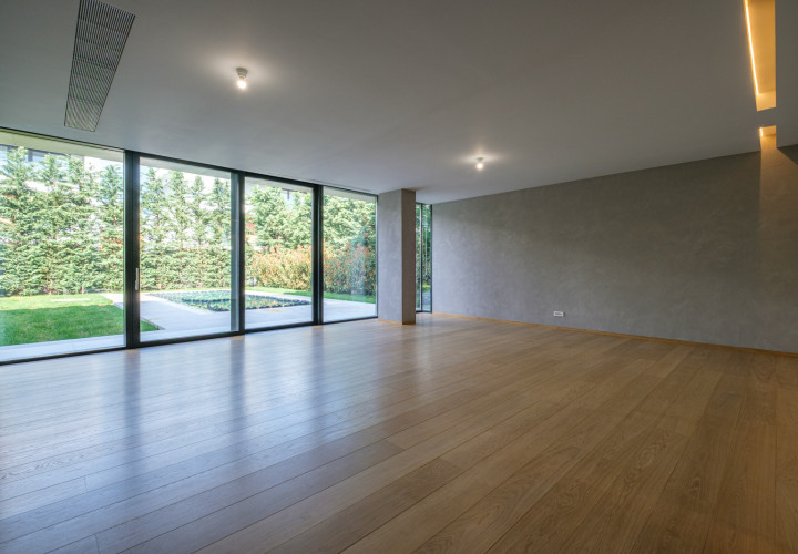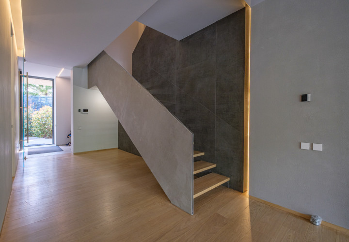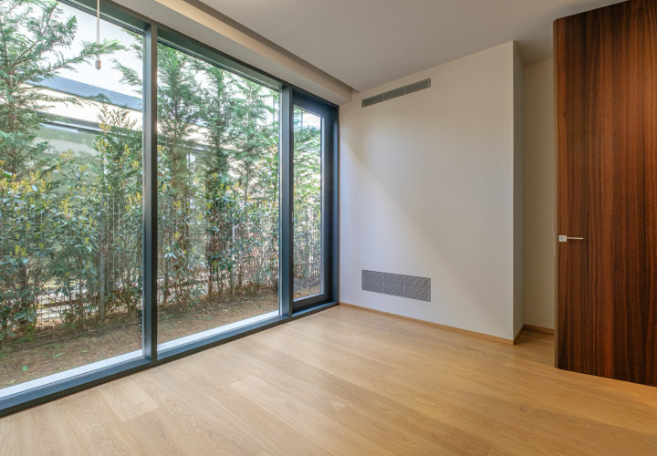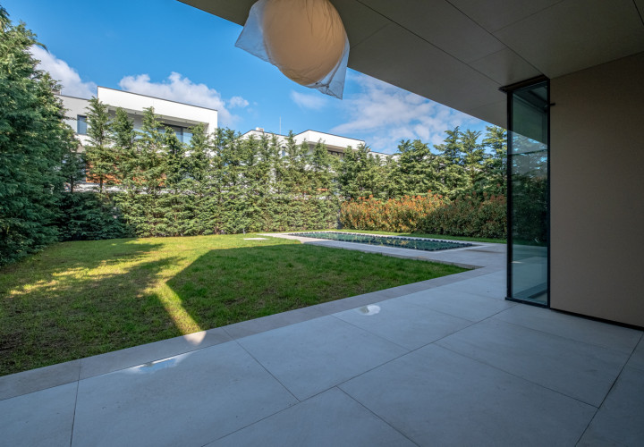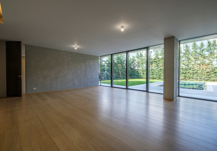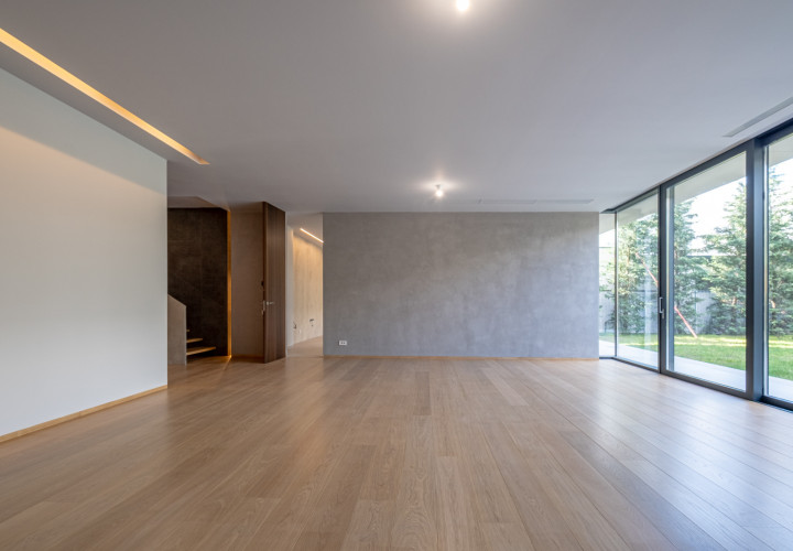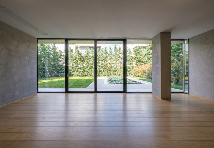 On the ground floor, an open-plan living and dining area of 58 sqm flows effortlessly onto an outdoor pool with perimeter channel and underwater lighting. The 23.5 sqm kitchen and carefully specified finishes — grade A oak parquet, Casalgrande Padana stone-look ceramics, Schuco triple-glazed aluminium facades — reflect an uncompromising approach to quality.